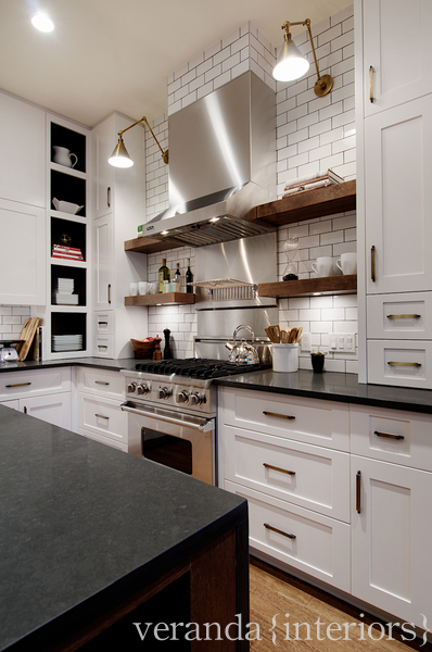 White subway with dark grout, Visual Comfort sconces in hand rubbed brass, open shelves…what more do you really need?
