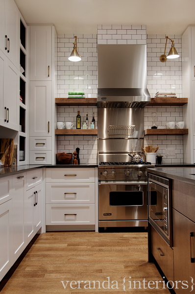 White subway with dark grout, Visual Comfort sconces in hand rubbed brass, open shelves…what more do you really need?