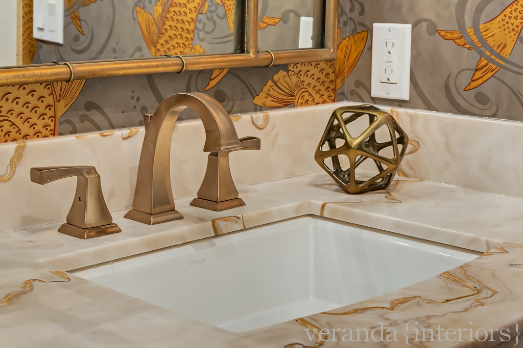 As soon as the clinet saw the marble below she gasped…and said ‘Can we use this’ with me replying with a ‘Heck yes!’ The brass of the faucets, hardware, lighting, and mirror play off of the ribbons of gold so beautifully!