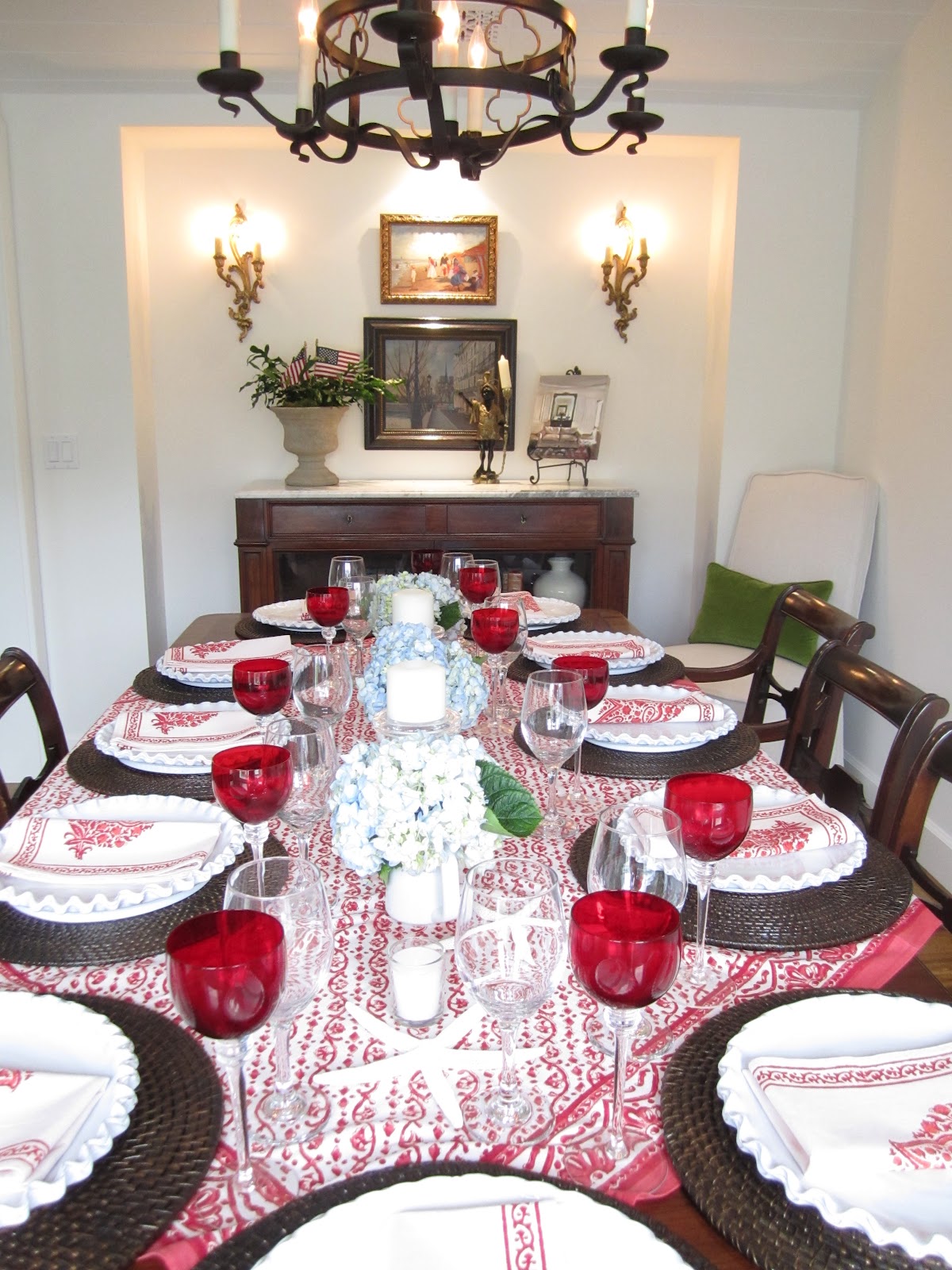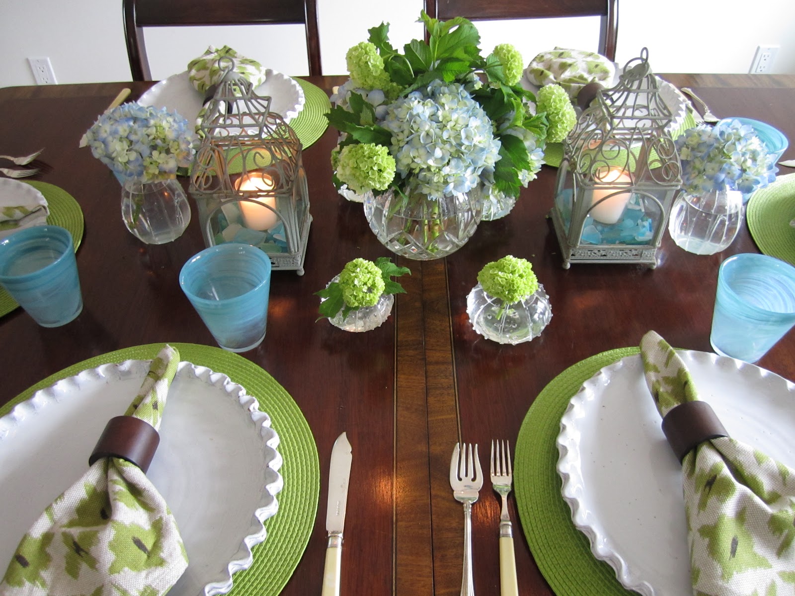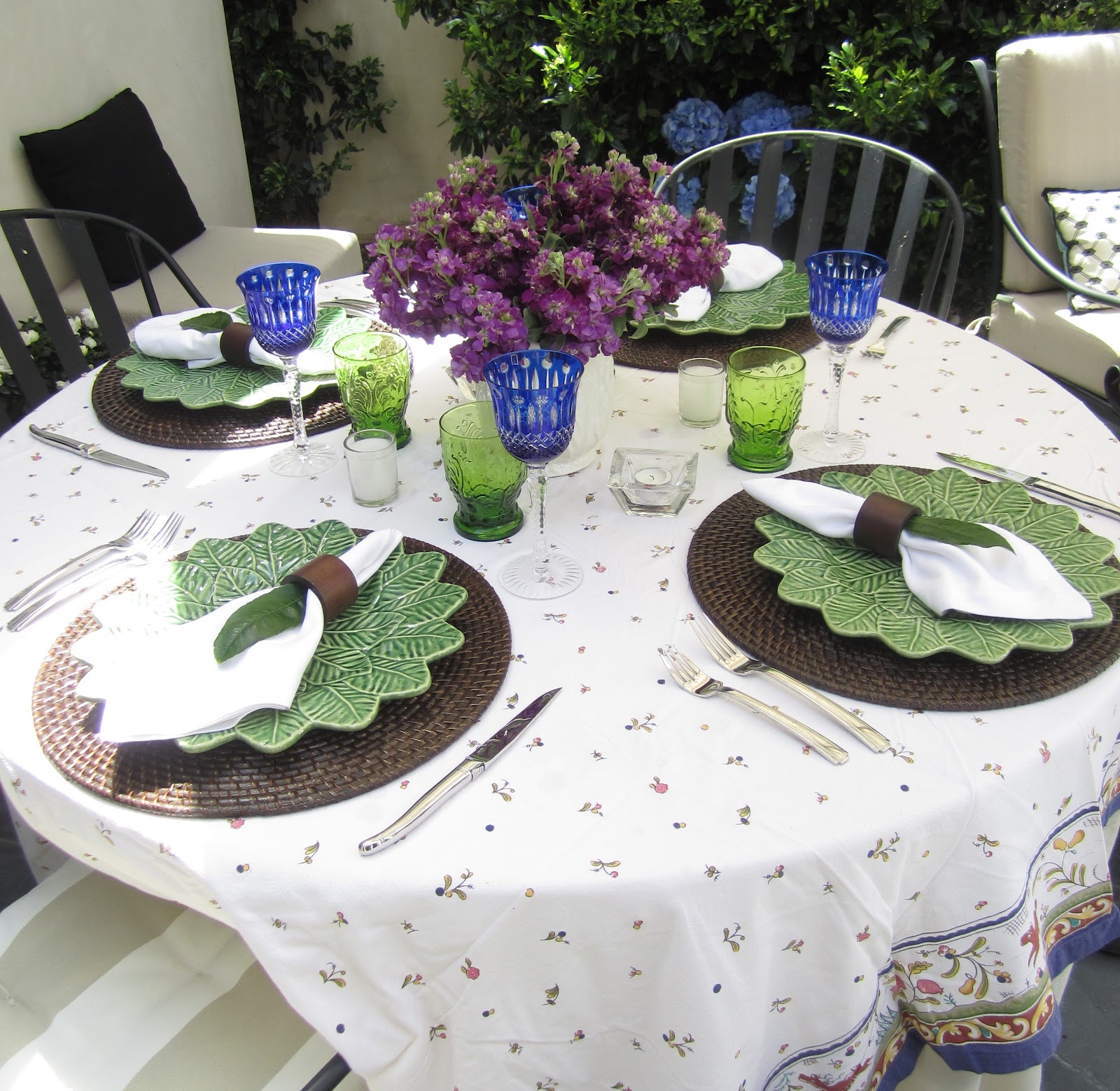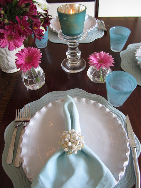 The aqua Provencal placements, napkins and glasses are from Home Goods.