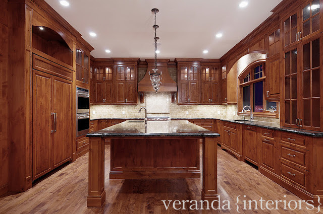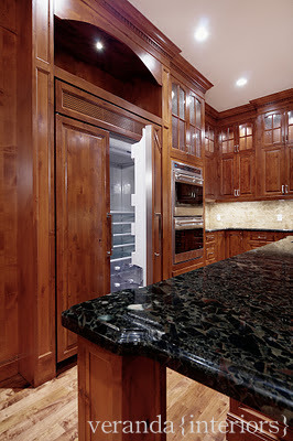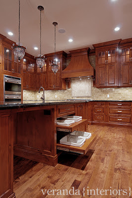 The 48″ Sub Zero built-in fridge is fully integrated with alder panels that match the cabinetry in the home, a great way to still have an amazing fridge without the large amount of stainless…perfect for a more traditional home. In the island we built pull out baskets in the island for the items that they use in the kitchen daily.