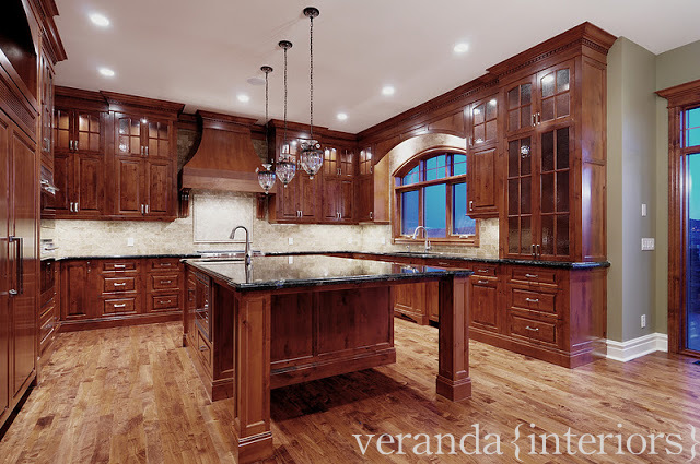 The flooring throughout the common areas of the main level are finished on site 3″ rustic maple with a dark brown custom stain applied at the time they were sanded, the perfect compliment to the rich tones of the cabinets.