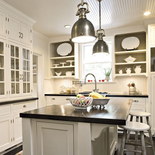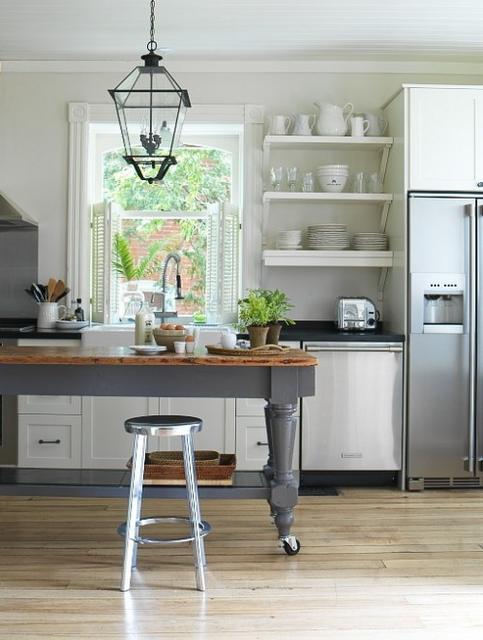 I love open shelving in a kitchen but I will admit I am too chicken to do it in my own. Why? I have the design already set in my mind and it just won’t work, or I should say, I am not letting it work. But I did manage to incorporate some into the Wexford II kitchen, you know, the fab gray kitchen I am planning on. Here are some great images that served as inspiration…