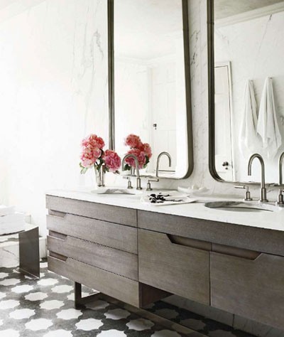 Check out this vanity design, pretty fabtastic (yes, fab, not fan) if you ask me. Thinking Altadore I master bathroom?