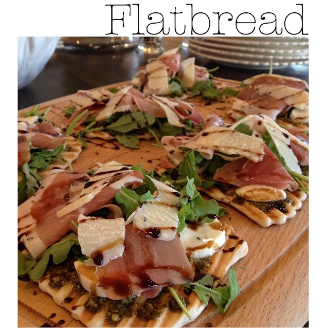 Spread a good amount of pesto along the top of the flatbread, top with a few slices of the fresh mottza, then a heaping handful of arugula, top that with some yummy prosciutto, then the shaved parmesan. Drizzle the balsamic & EVVO on top of the breads and sprinkle with the black salt.