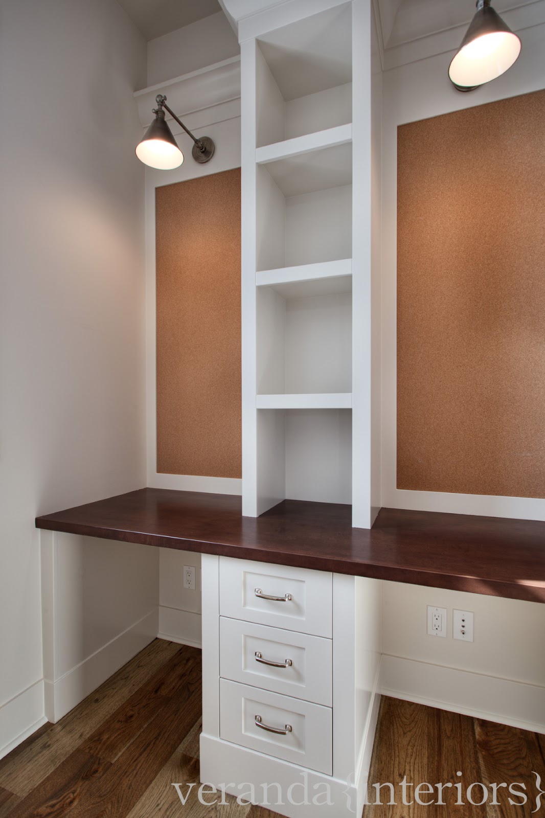 The image on the right is a portion of the homework room. There are actually 3 desk areas in this space, each with a cork board and Visual Comfort light above each work space. I love the fact that it is off the kitchen so mom can keep an eye on the boys while she is doing her thing in the kitchen.