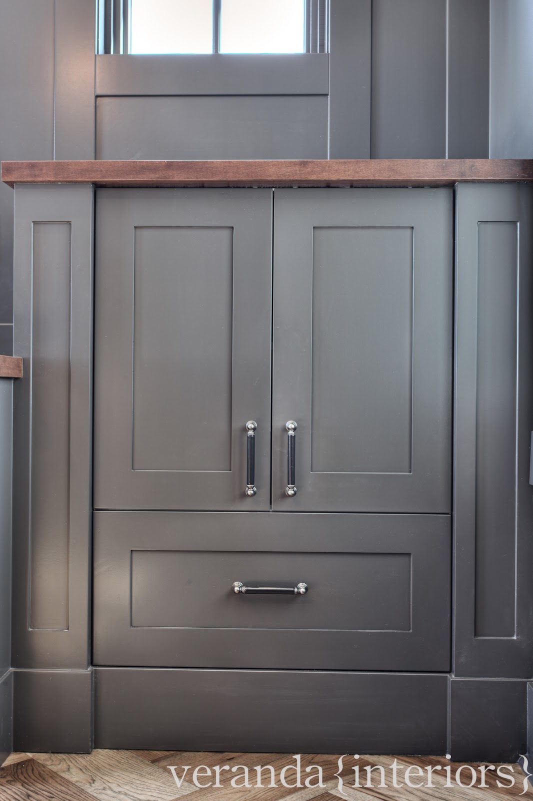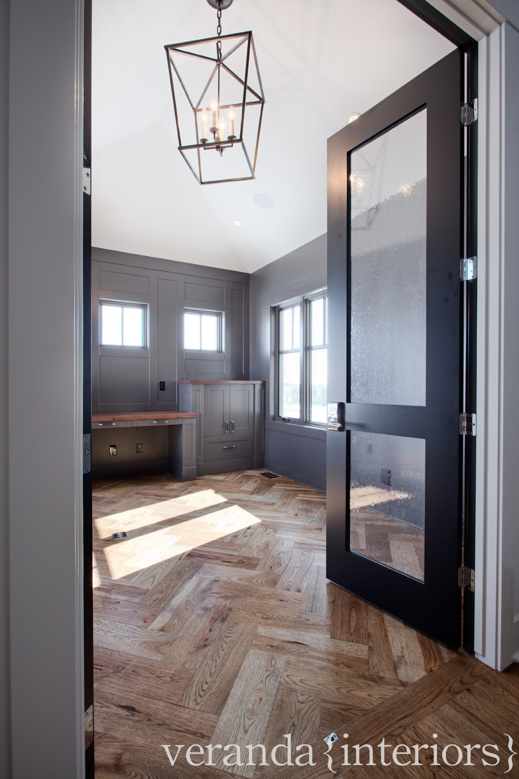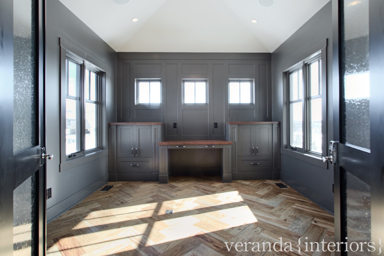 Dark and stormy, that is what I was calling this room…maybe because I was drinking one when the idea came to me?? Ha! We had all of the millwork, walls, cabinetry, and paneling in this room painted out the same dark color (BM Iron Mountain). Combined it with a vaulted ceilings, Visual Comfort light, and herringbone floors and BAM…one sexy office for him. We are adding in lots of chrome and leather to this space which will really make it a showpiece.