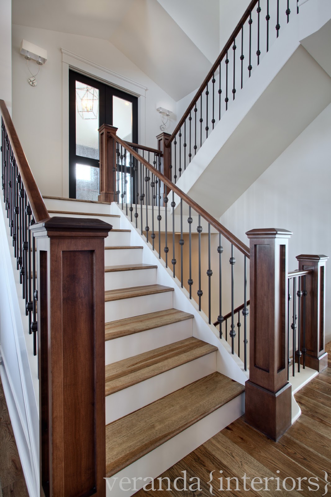 The staircase is the focal point when you walk in the front door, so it had to have substance, that is what the custom shaker style post and two toned stairs bring to this space. Off to the right of the foyer is the dining room, a light with some bling and a rich dark navy for the walls to work off of the existing dining room set the cleints had.