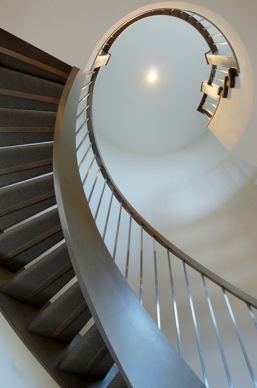 Adding a stacked stone to the fireplace with an offset block style mantle adds a natural element that helps bring warmth into the space and it is a great compliment to the 6″ wide Hickory flooring. The curved staircase has a closed stringer with open carpet risers, this helps the flow of the plan keeping every bit of it ‘open’.