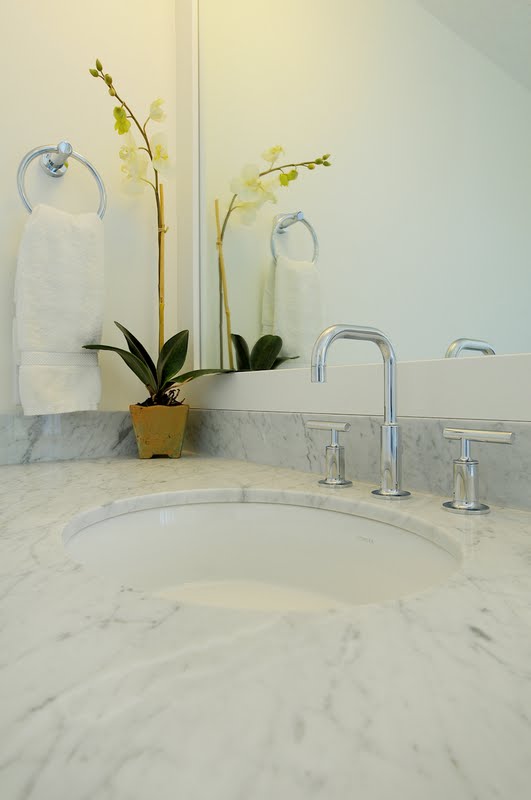 For the master bathroom I wanted calm, clean, crisp, white. It is such a soothing space with the light that floods in through the bow (can you tell I love this window design yet?). We used Daltile Fabrique for the floors & shower walls, white carrara vanity tops, and Kohler Purist faucets in polished chrome.