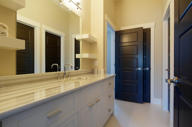 Now how fun is this Jack & Jill bathroom, I am so in love with this vanity top! Keeping the entire space white I let the counter speak for itself.&nbsnbsp;